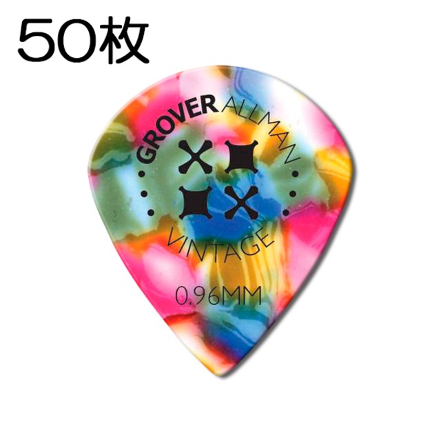 世界で3,500万枚以上の販売実績を誇るGROVER ALLMANのピックです(50枚セット) ビンテージ・セルロイドピックはトラディショナルな形、スムーズなピッキングと温かい音が特徴です。 キレがありカッティングなどのリズムギターに有効なうえ、リードでもキレがある。 【形状】ジャズ 【厚さ】0.96mm / 1.14mm / 1.35mm 【色】レインボー